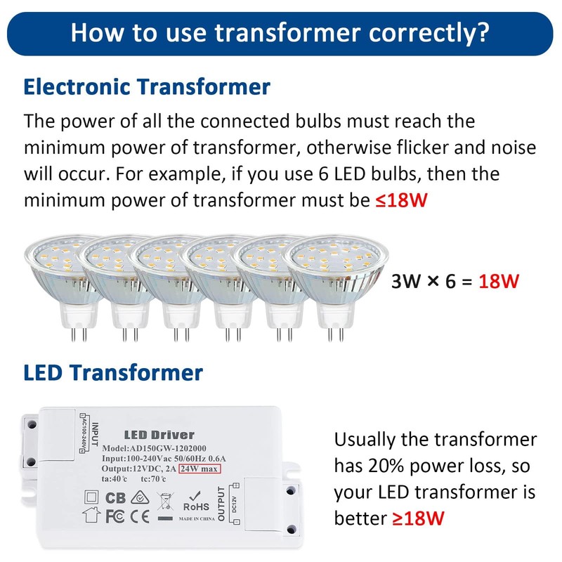 - ★【GU5.3 12V】: LED GU5.3 12V AC/DC. We recommend using an LED transformer. When using a halogen transformer, all connected bulbs must reach the minimum output power of the transformer. Otherwise, the LED lamp will flicker or be damaged.