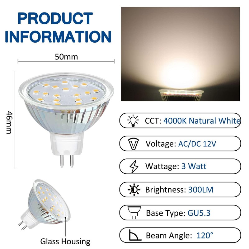 - ★【Energy saving】: 12 V MR16 GU 5.3 LED neutral white 4000 K with 18 SMD LEDs, 300 lm, 120 degree beam angle. GU5.3 3W LED are an ideal replacement for the GU5.3 20W halogen, reduce energy consumption by more than 85%.