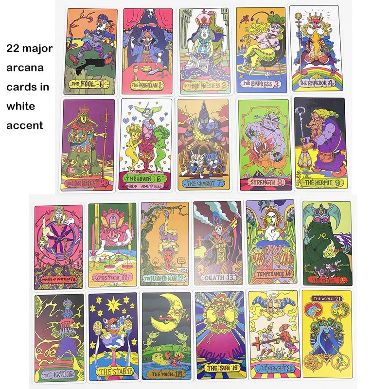 - JJBA タロットカード84枚:デッキには22枚のメジャーアルカナカード(合計44枚)+ ファンアートメジャーアルカナカード22枚 + ロイヤルゴッドカード9枚 (全18枚)、他の販売業者には31枚または53枚のカードのみが含まれます。デッキは最もコンテンツを含むエディションです。