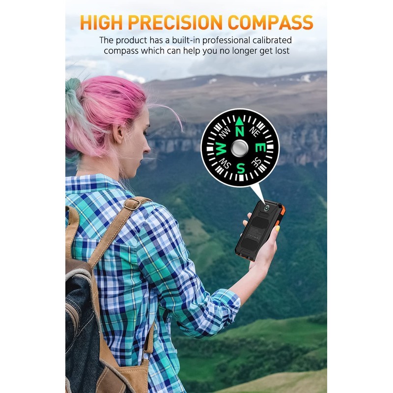 - The solar charger comes with a high-precision compass: Own comes with a portable compass, a handy tool for outdoor activities, like camping, cycling, fishing, traveling, hiking and beaches.
