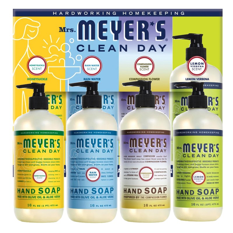 Mrs. Meyer's Clean Day Hand Soap Variety Pack, 4-Scent Pack (Honeysuckle, Rain Water, Compassion Flower and Lemon Verbena), 16 fl oz Each