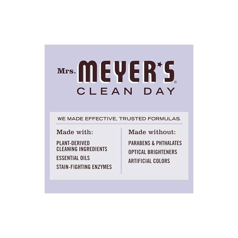 Mrs. Meyer's Clean Day HE laundry detergent features hardworking yet gentle cleaning agents, while also providing a special, singular scent for your home. Our Lavender scented laundry detergent has long been prized for its original and clean floral scent. Such a pretty and reassuring herb! Effective yet gentle on clothes, our concentrated laundry soap really packs a punch when it comes to removing dirt and grime. Contains surfactants from plant-derived sources, dirt and stain-fighting enzymes, essential oils, other thoughtfully chosen ingredients and, of course, are always made with a cruelty-free formula. This biodegradable formula liquid detergent is HE compatible. Concentrated for 64 loads of laundry. Also available in other garden-inspired scents and products such as body lotions, liquid hand soaps, candles, and so much more! Mrs. Meyer's - Rooted in Goodness.
