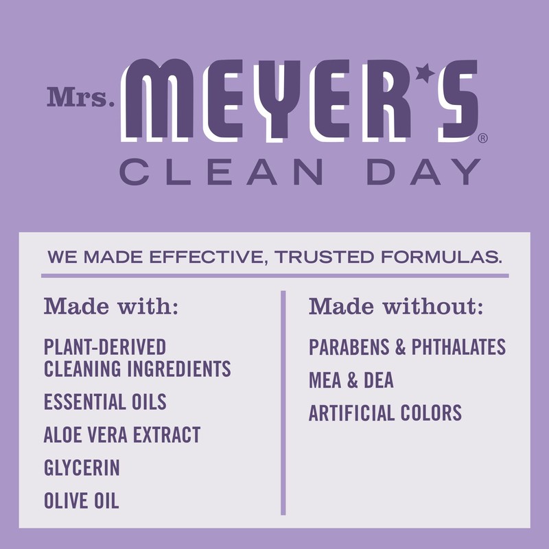Mrs. Meyer's Clean Day hand soaps are specifically made to clean and freshen hands without over drying, while also providing a special, singular scent for your home. Lilac scented soap has a fresh, floral fragrance. For many, the scent of lilac is the sweetest sign of spring - both clean and charming! This hardworking hand soap formula contains olive oil, aloe vera, and essential oils, and thoughtfully chosen ingredients that clean and freshen hands. Made without parabens, phthalates or animal-derived ingredients and always a cruelty-free formula soap. Also available in other garden-inspired scents and products such as Dish Soap and Multi-Surface Cleaner. Mrs. Meyer's - Rooted in Goodness.