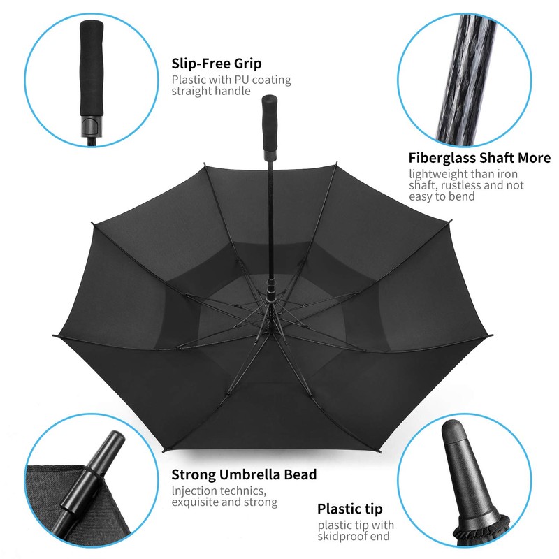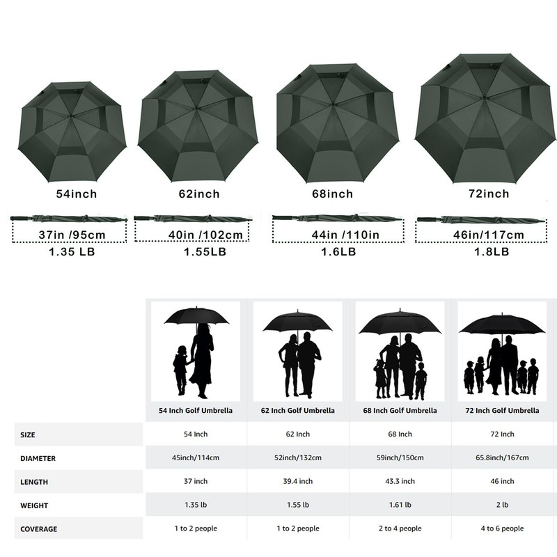 - [EXTRA-LARGE ] The super-comfortable rubberized anti-slip handle with a golf grip-like shape makes this extra larger golf umbrella comfortable, easy to grab and fits most umbrella holders, perfect for golf, sport, business, travel or daily use. 62" fit 2~3 people, 68" fit 3~4 people, 72" fit 4~5 people.