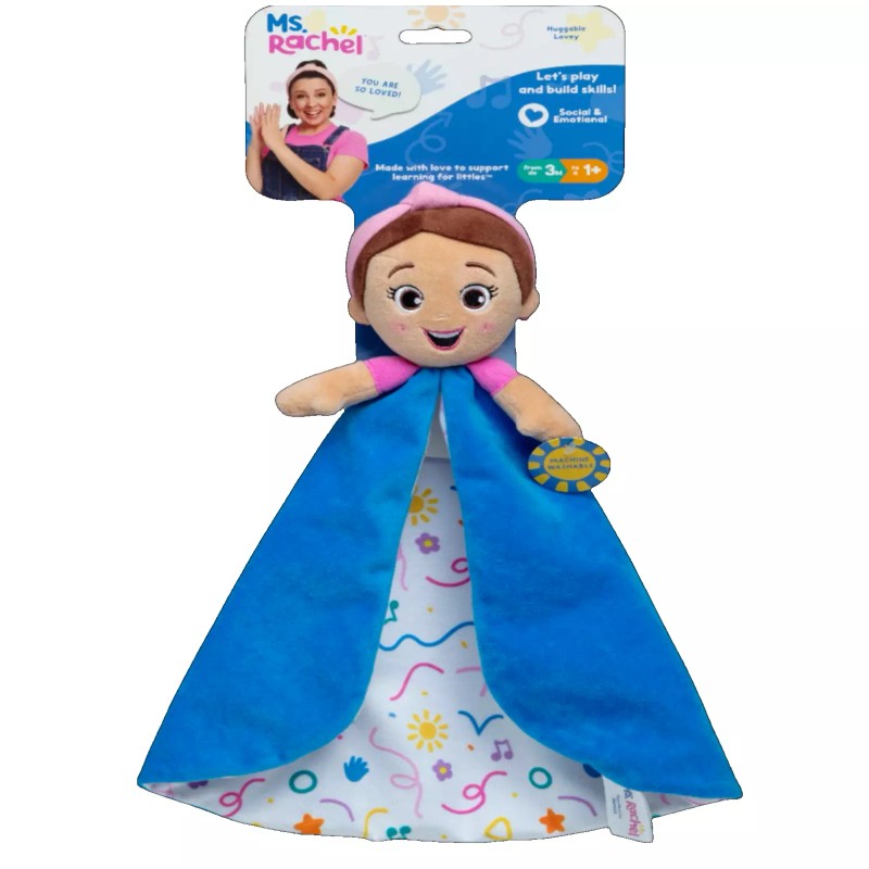 Cuddle up to a super-soft lovey blanket, featuring Ms. Rachel’s friendly face, and patterns and colors babies love.