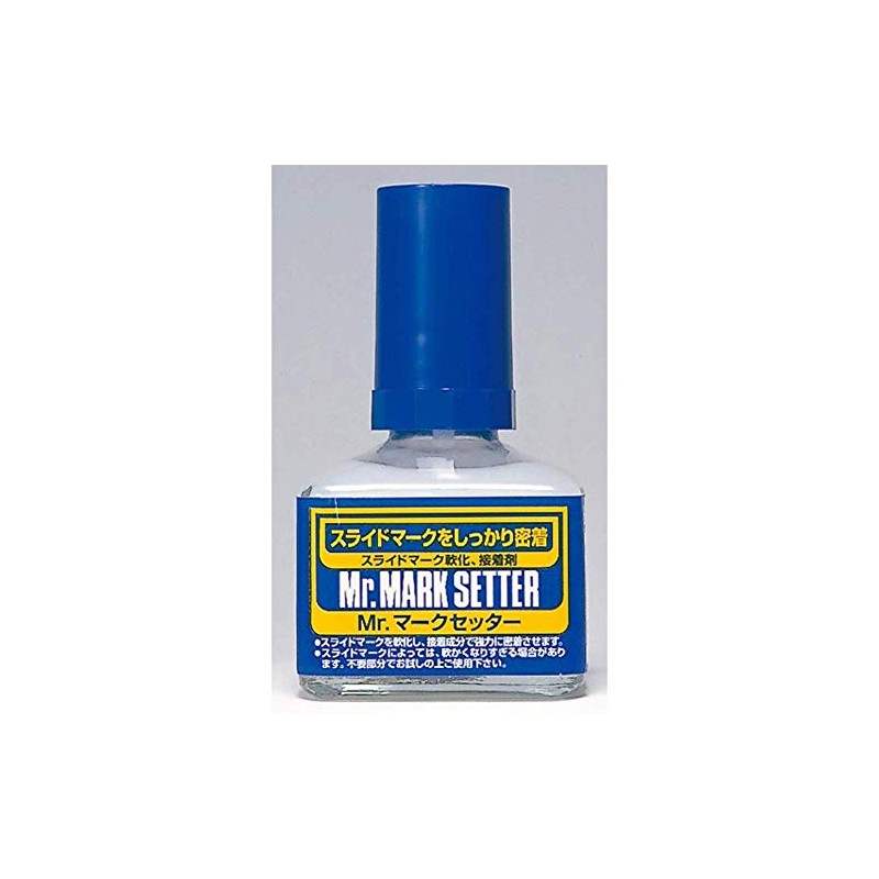 Using Mr. MARK SOFTER together with Mr. MARK SETTER (which gives decals greater adhesiveness) makes it much easier to affix decals to plastic models. First, the area to which the decal will be affixed is painted and the decal is applied. After air bubbles are removed by pressing on the decal with a cotton swab, a coating of Mr. MARK SOFTER is applied and allowed to dry. Because the decal now has greater adhesiveness, adhesive silvering (the floating and shiny quality of the clear parts of decals) can be firmly affixed to uneven surfaces. It is perfect even for poorly made decals from Eastern European models. Decals have better adhesiveness if the painted surface is prepared to have a glossy appearance, and they gain an appearance that suggests they were drawn by hannd.