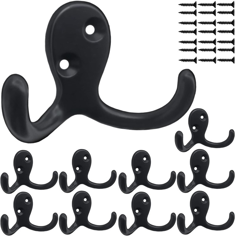 MsBong Coat Hooks Hardware, 10Pcs, Hooks Heavy Duty for Hanging Coats No Rust Double Robe Hooks Wall Mounted for Key, Towel, Bags, Cup, Hat (Black)