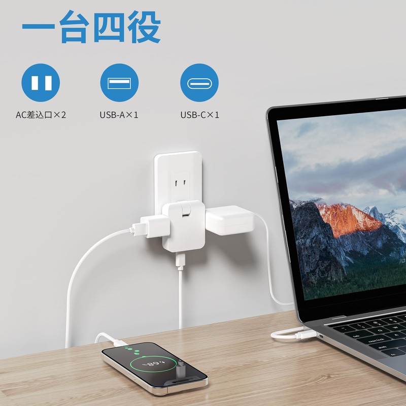 - 4-in-1 Compact Tap: Equipped with 4 outlets (2 AC outlets, 1 USB-A, and 1 Type-C port), it can be used with a wide range of household appliances and smart devices. Multi-use for home and office use, maximize space efficiency. The USB port makes it convenient to use when traveling