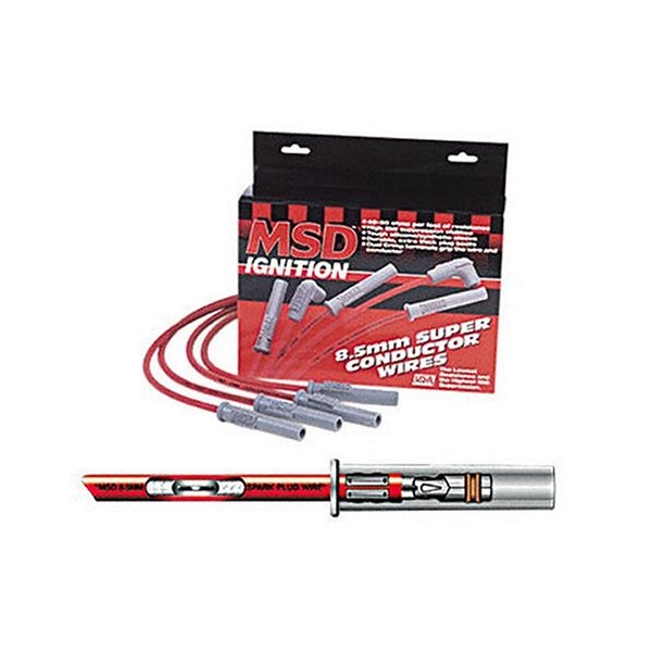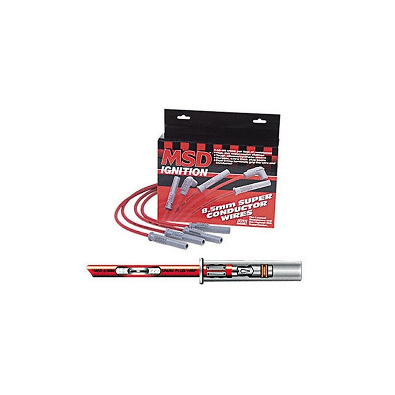 The MSD 8.5 Mm super conductor wire is the performance wire. Engineered from the inside out, the 8.5 Offers everything you have ever wanted in a wire; incredibly low resistance without electronic interference. In a single 12 inch Length of super conductor wire there is only 40 to 50 ohms of resistance. That is the lowest resistance of any helically wound wire. To accomplish this, we use a copper alloy conductor due to it's great voltage carrying capabilities. The low resistance results in less loss of spark energy so more reaches the spark plug. The conductor is wound extremely tight around a special center core. So tight, that there is over 40 feet Of conductor wrapped into a single foot of plug wire. This winding procedure, combined with a Ferro-magnetic impregnated center core, produces an extremely effective electro magnetic interference (EMI) choke.