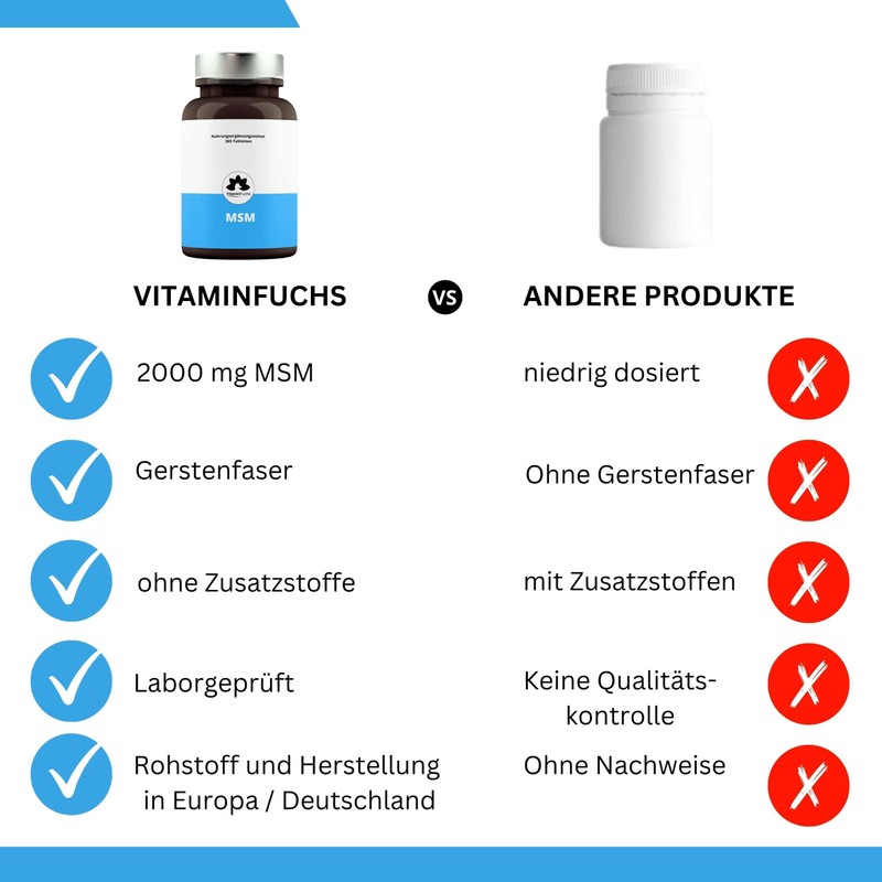 • ✅𝗩𝗘𝗥𝗭𝗘𝗛𝗥𝗘𝗠𝗣𝗙𝗘𝗛𝗟𝗨𝗡𝗚 - Im Gegensatz zu anderen Herstellern bieten wir von VitaminFuchs Ihnen mit unseren Nahrungsergänzungsmitteln absolute Profiqualität! Mit nur 2 hochdosierten MSM Kapseln pro Tag decken Sie Ihre empfohlene Tagesdosis ab!