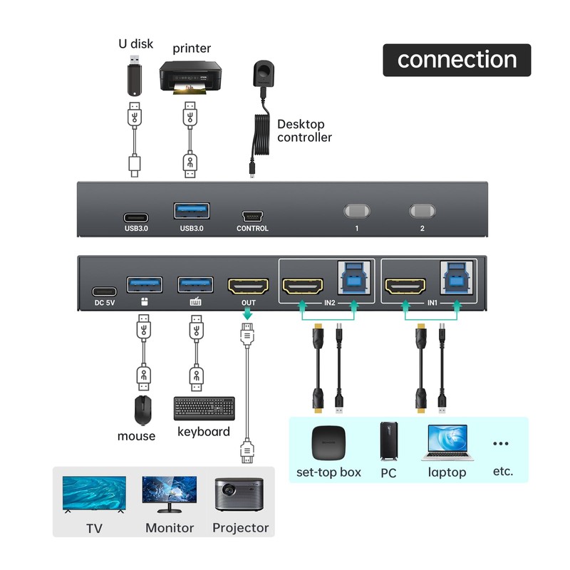 - This USB 3.0 HDMI KVM Switch allows control of two computers, enabling them to share a single monitor along with keyboard, mouse and 2 USB 3.0 Devices.