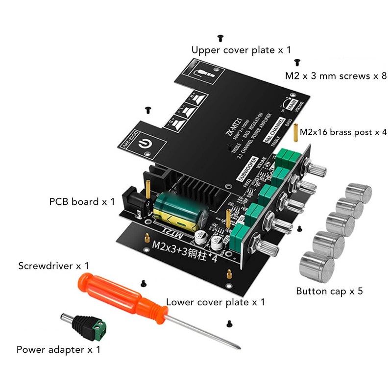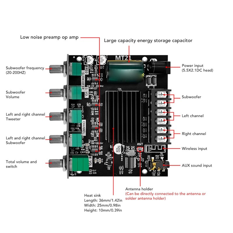 - DC Converter Plug: Amplifier board can use commercially available DC adapter (plug specification 5.5mmx2.1mm) to basically meet the needs of MT21 Bluetooth power amplifier board. If your existing DC power plug is not 5.5mmx2.1mm, there is no problem, because we include a DC adapter in the product.