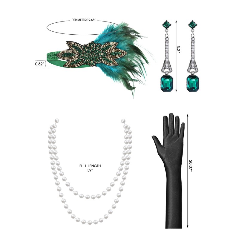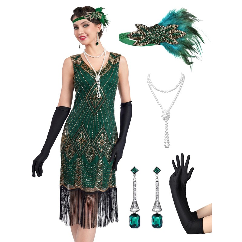 - Package Included: 1 x Sequin Dress, 1 x Feather headdress, 1 x Long Satin Gloves, 1 x Pearl Necklace, 1 x Vintage Earrings. These complete and classic flapper accessories enhance the exquisite and fashionable sense of this 1920 fringe dress. The Feather headdress is the finishing touch of the perfect retro style, adding a touch of sparkle and glamour to the overall look.