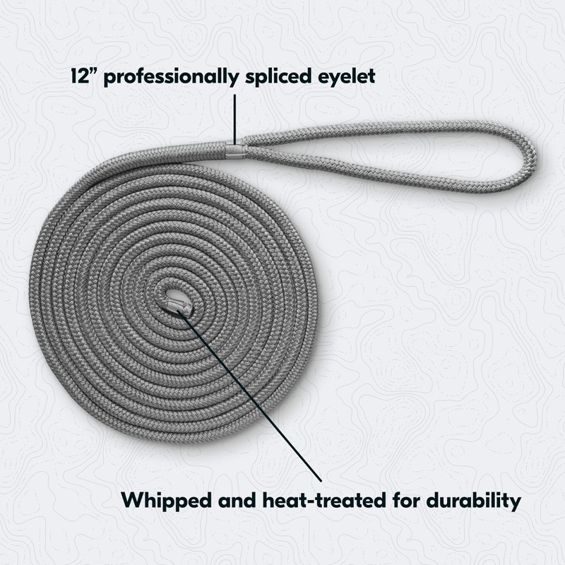 Montauk Rope Double Braid Dock Lines with Pre-Spliced Loop (Grey, 1/2" x 20 Feet)