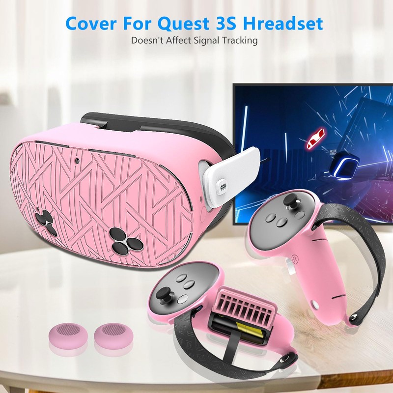 MTomatoVR Silicone Cover Set for Quest 3s Accessories Included Battery Opening Controller Grips, VR Silicone Shell Headset Cover, Face Cover, Lens Cover, for Meta Quest 3s, Pink