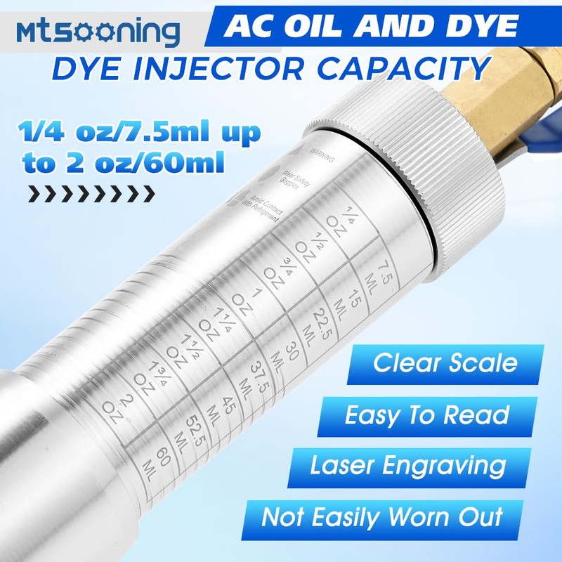 - AC Oil Dye Injector:This AC oil and dye injector holds 1/4 oz/7.5ml up to 2 oz/60ml, featuring a ball valve that separates the coupler from the injector. It's designed to inject oil and dye through the low-pressure suction side, directly into the AC compressor for efficient maintenance and leak detection