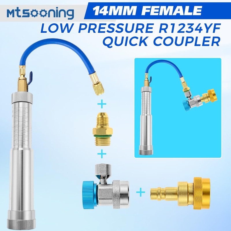 - Package Includes: 1 x AC oil and dye injector with 2oz capacity,1 * R1234yf to R134a adapter, 1 * dual head core removal tool, 1 *R134A low side quick coupler, 1 * R1234yf quick coupler, 2 * Oil Checkers