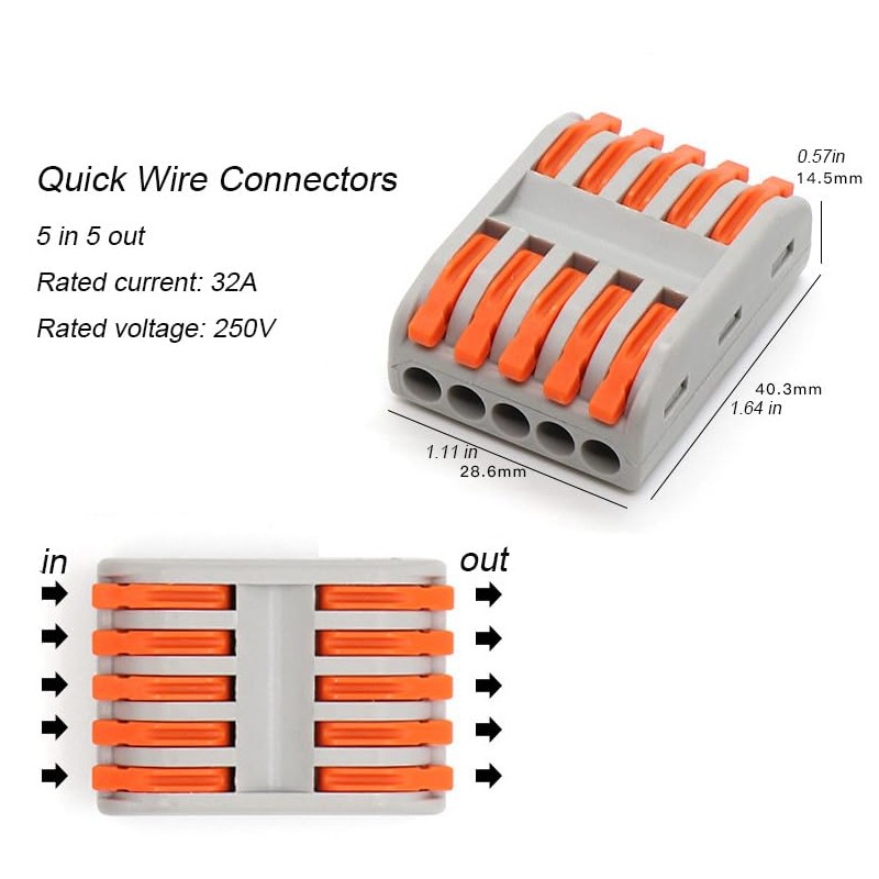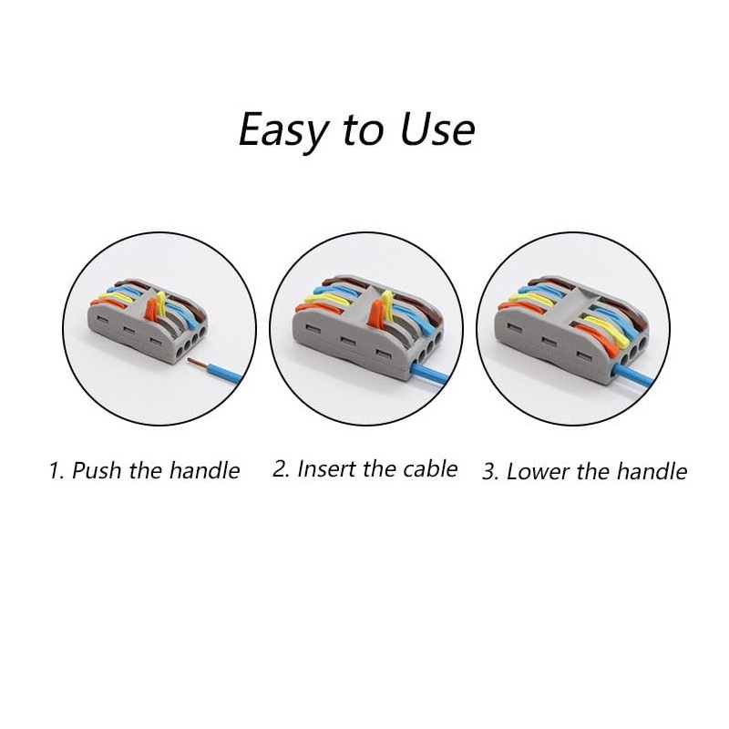 - 【Easy to Use】only need to Strip wire lead to 9-10mm, lift lever to 90 degrees, insert the correct colored wire to the end of the terminal, and push the lever back down. Instead of traditional electrical tape and intertwined butt connectors, It makes life easier and saves more than 80% of wiring time.