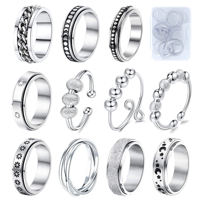 - [Unisex Gifts]You will get 3 fidget rings with beads, 2 moon star ring, 1 sandblast finish ring, 1 triple interlocked rings, 1 chain rings fidget, 1 bali stress rings, 1 flower ring, 1 cubic zirconia ring[Gift Box]Best gifts for yourself, friends, lover and families for Birthday, Holiday, Anniversaries, Christmas Day, Valentine's Day and More.