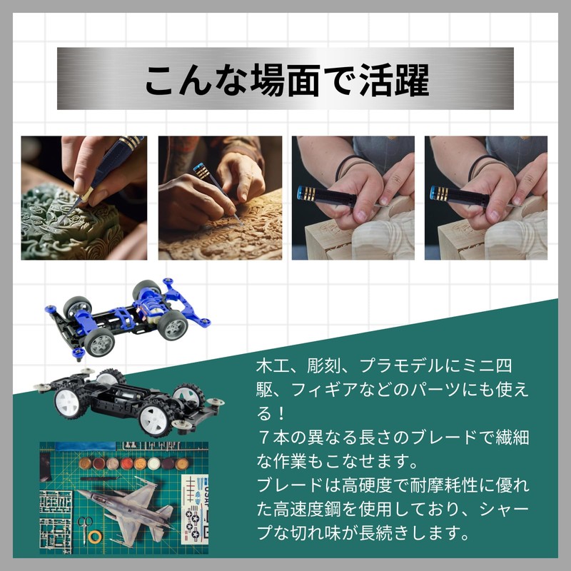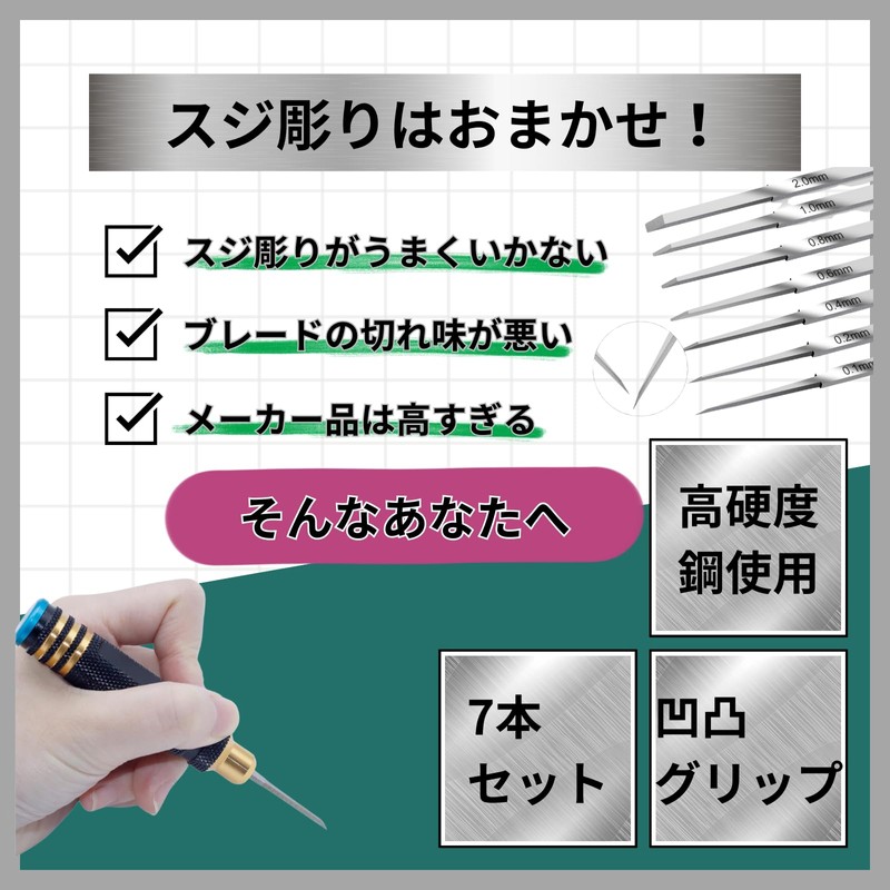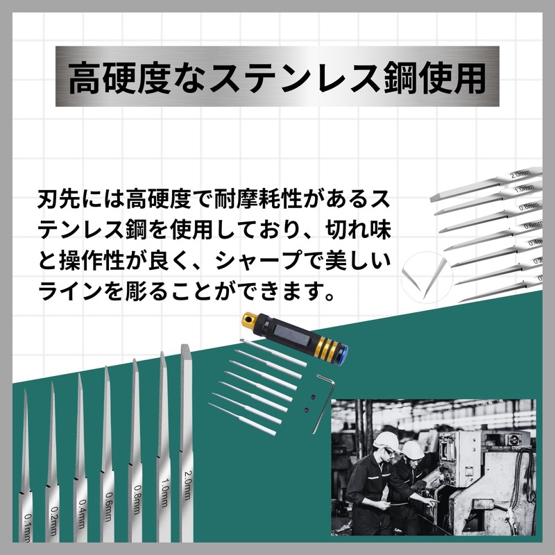 - Set Contents: Holder x 1, chisel x 7 (blade width: 0.1, 0.2, 0.4, 0.6, 0.8, 1.0, 2.0 mm), imo screws x 2, hex wrench x 1, chisel dedicated case x 1