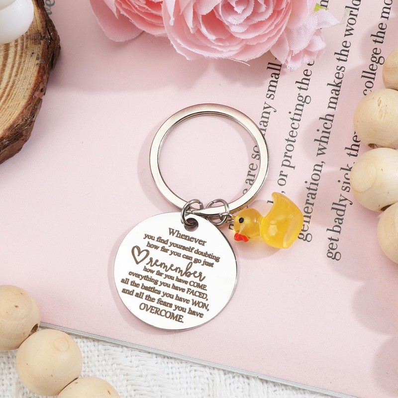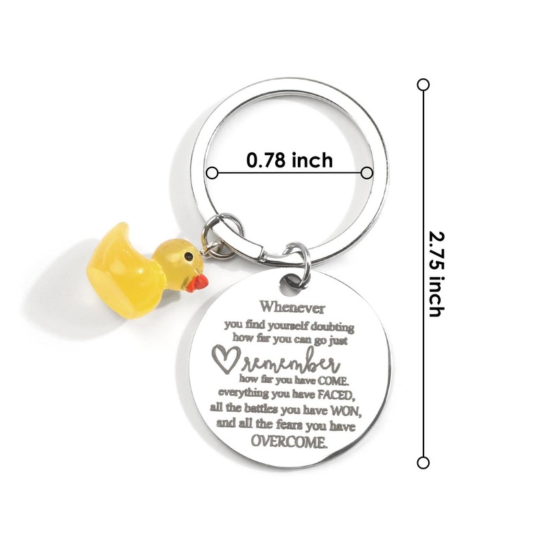 Unlock a world of motivation with our delightful Inspirational Duck Keychain, a charming accessory that adds a sprinkle of positivity to your day! Adorned with an adorable yellow rubber duck charm, this positive keychain serves as a constant reminder of your worth and the impact you have on the world. Inscribed with the uplifting phrase, "Whenever you find yourself doubting how far you can go just remember how far you have COME,everything you have FACED,all the battles you have WON,and all the fears you have OVERCOME."it is designed to inspire confidence and self-appreciation.Crafted for those who cherish little joys, this motivational keychain is not just a practical accessory for your keys; it's a heartfelt gift for the remarkable people in your life. Whether it's for a birthday, a special occasion, or just to brighten someone's day, this thoughtful treasure makes the ideal present for friends and family. With its cute duck charm, this inspirational keychain is ideal for anyone who embraces positivity and seeks inspiration in everyday life. When you gift this duck keychain,you are not just offering a cute accessory, but a symbol of encouragement and pride. Brighten up your loved one's life with this enchanting piece that effortlessly blends functionality with a touch of charm. Celebrate the spirit of motivation and show your affection with our rubber duck keychain – a small yet meaningful gesture that can make a big difference! Order yours today and share a wave of inspiration!