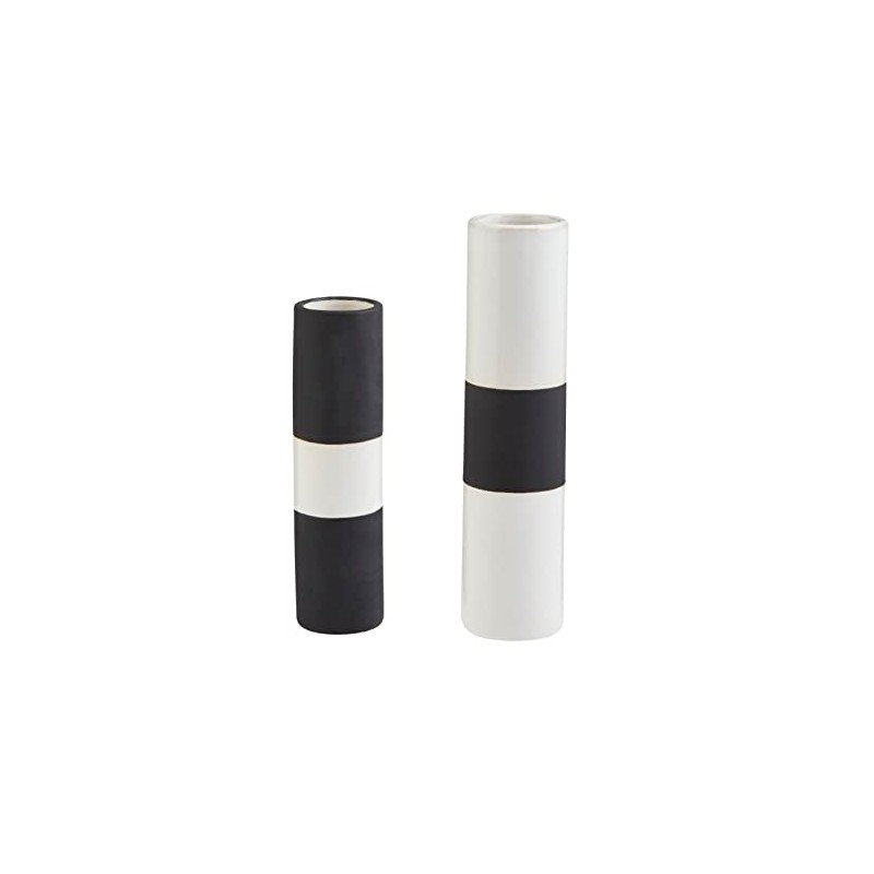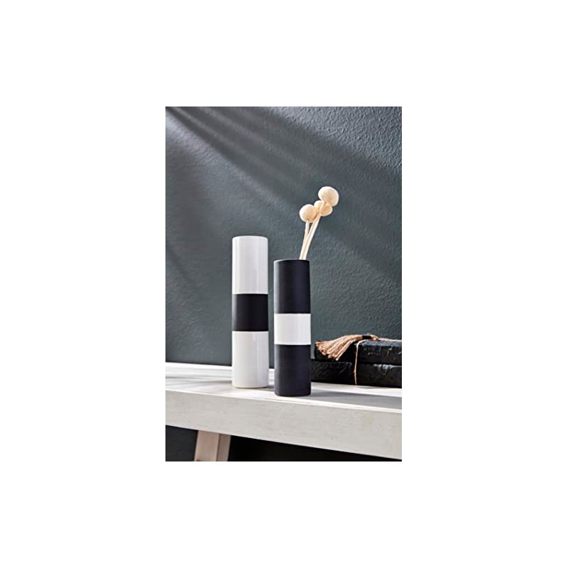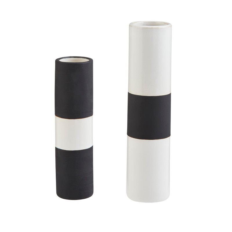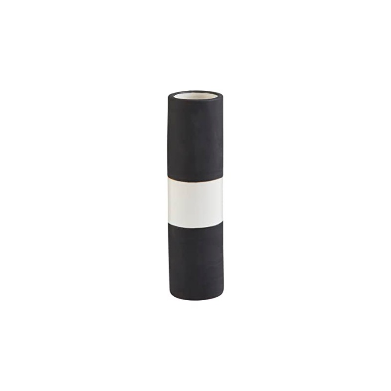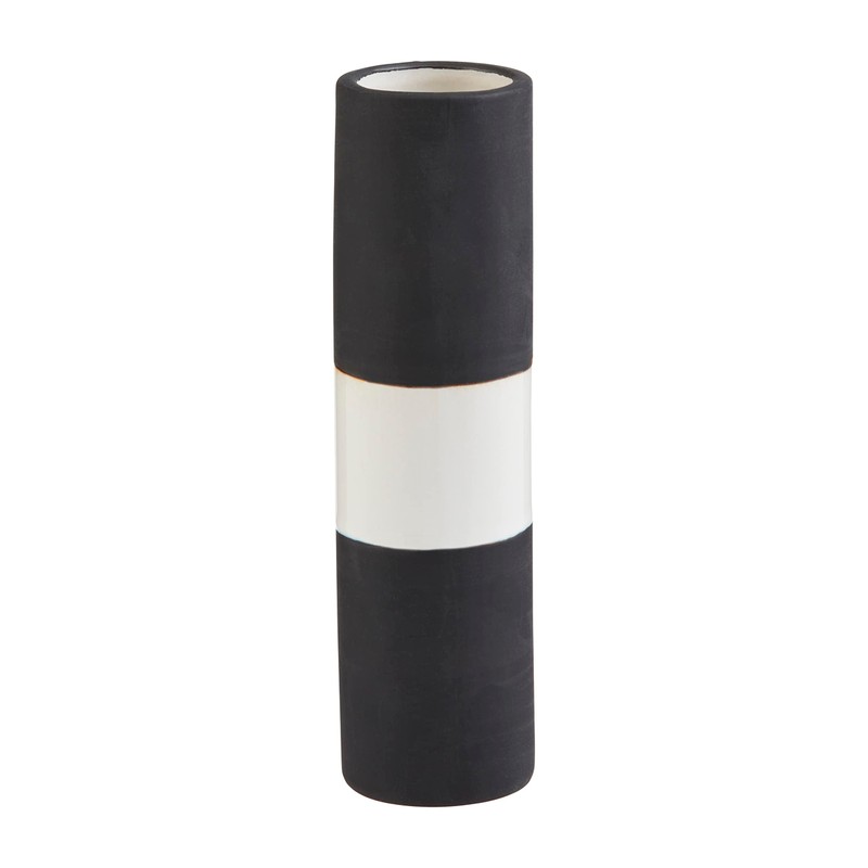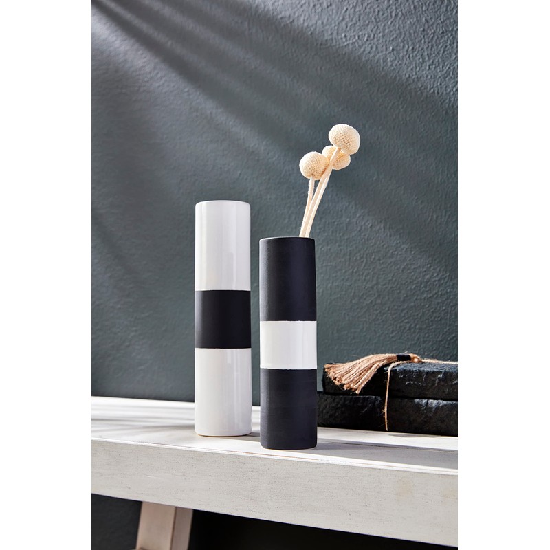 • The thin glazed stonware bud vase comes in a black and white striped pattern
