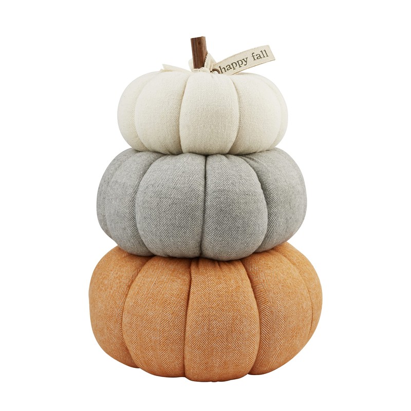 - Stacked canvas and cotton pumpkins feature wooden stem, canvas bow and printed canvas grommeted tag.