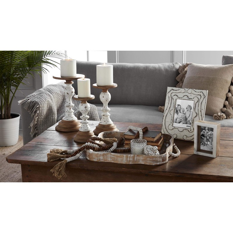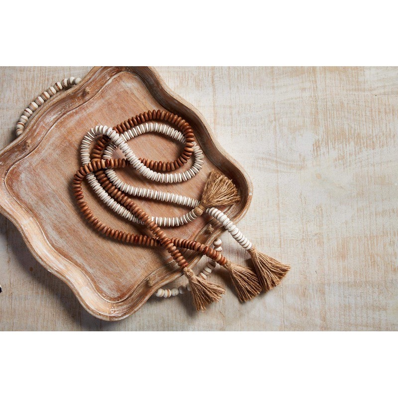 - Distressed mango wood beads strung on jute twine with tassel ends.