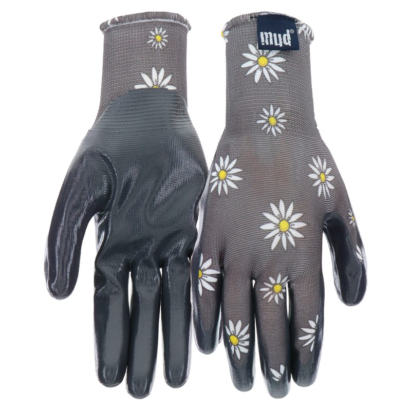 MUD Simply Women's Daisy Printed Nitrile Coated Palm Garden Gloves, Superior Grip, Extreme Comfort, Gray, Small/Medium, (MD31001G-WSM)