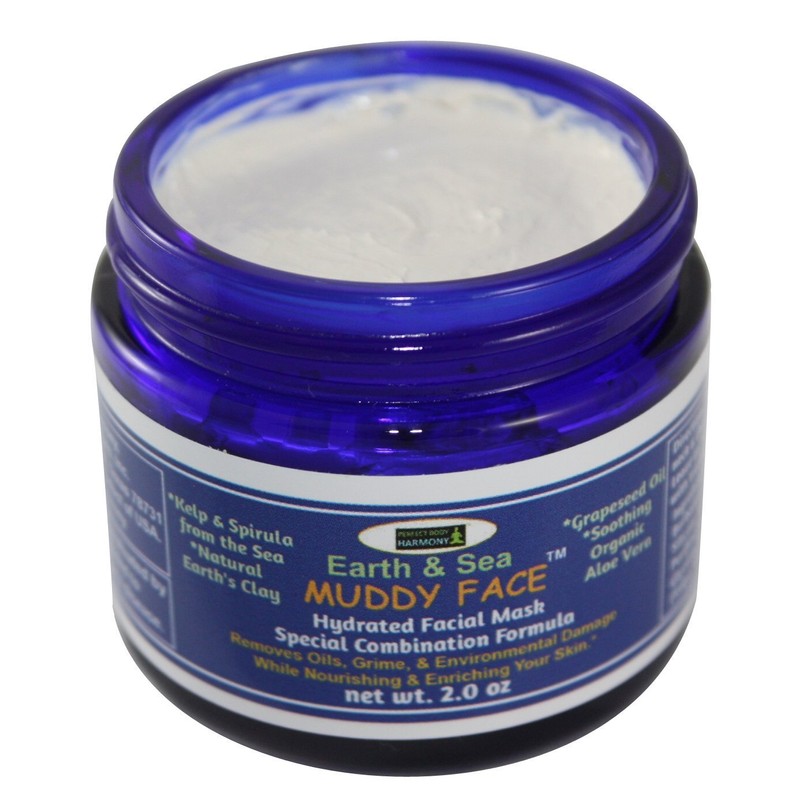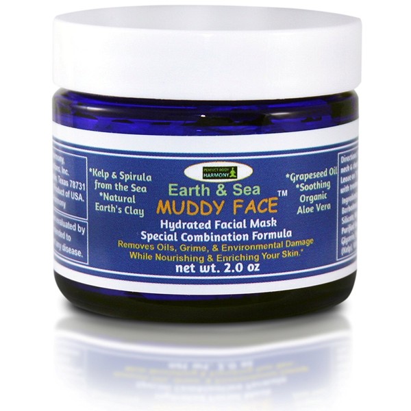 MUDDY FACE (Earth & Sea) Pre-Mixed (Hydrated) Spa Quality Facial Clay Mud Detox Mask, Organic Aloe Vera, Grapeseed Oil, Vit. C, Kelp & Spirulina Seaweed, Minerals, Kaolin & Bentonite Clay, 2.5 oz Jar