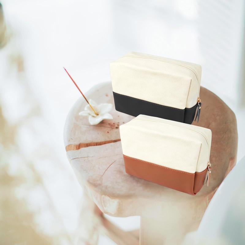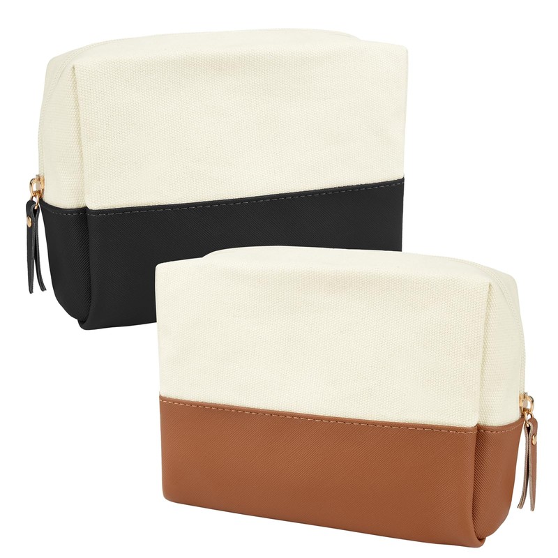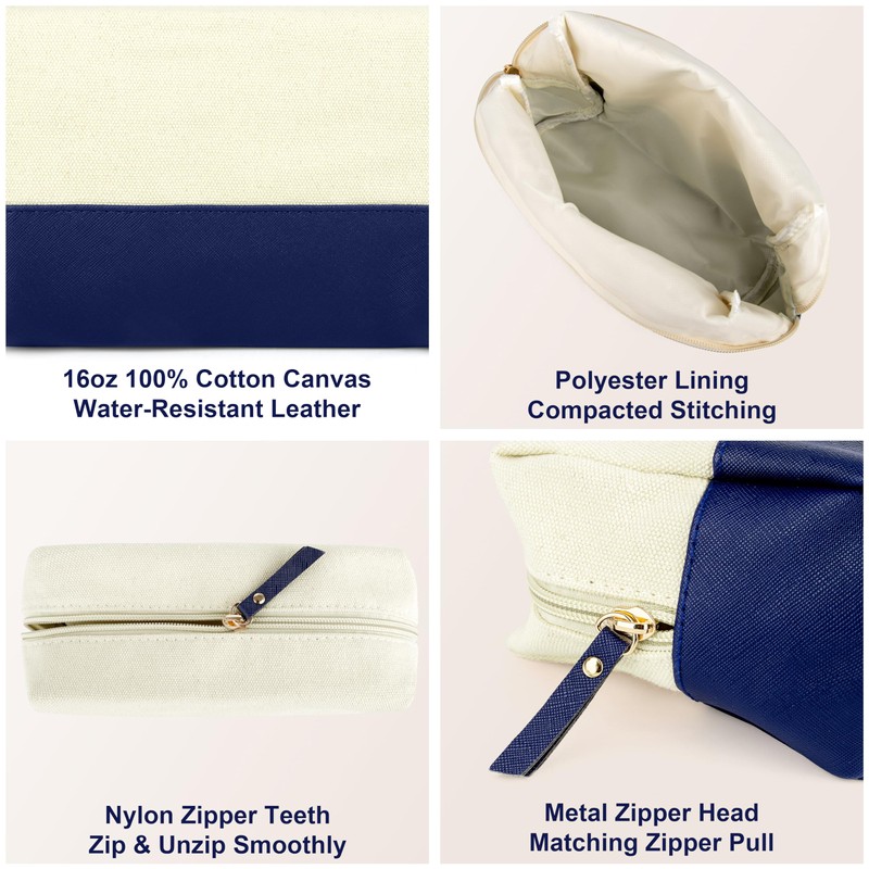 - Heavy Duty Construction: pack of 2 x cotton makeup bag with PU leather bottom; unique combination of 16oz 100% cotton canvas and PU leather, interior thick lining, compacted stitching throughout, all of these features make it become a superior storage bag and bear more weight
