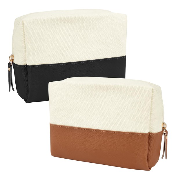 Muka 2 Pack Canvas Makeup Bag with PU Leather Bottom, Large Capacity Travel Cosmetic Case-Black & Brown