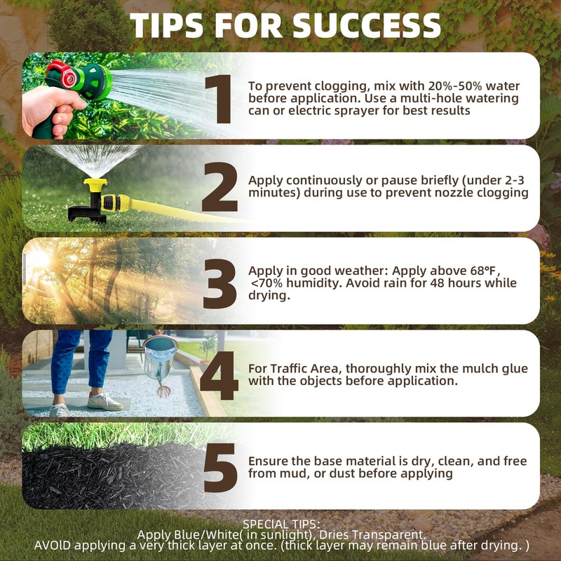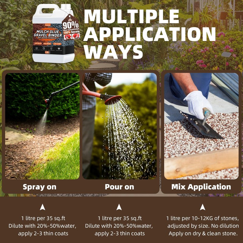 - 【Easy-to-Apply Mulch Glue】Simply shake and spray with any standard garden sprayer for quick, mess-free application on pea gravel, wood chips, or decorative stones. For best results on fine mulch, mix with 20-50% water before spraying, then lightly rake and apply 2-3 coats(Keep each layer ≤1 inch thick)for unbeatable erosion control and long-lasting hold.
