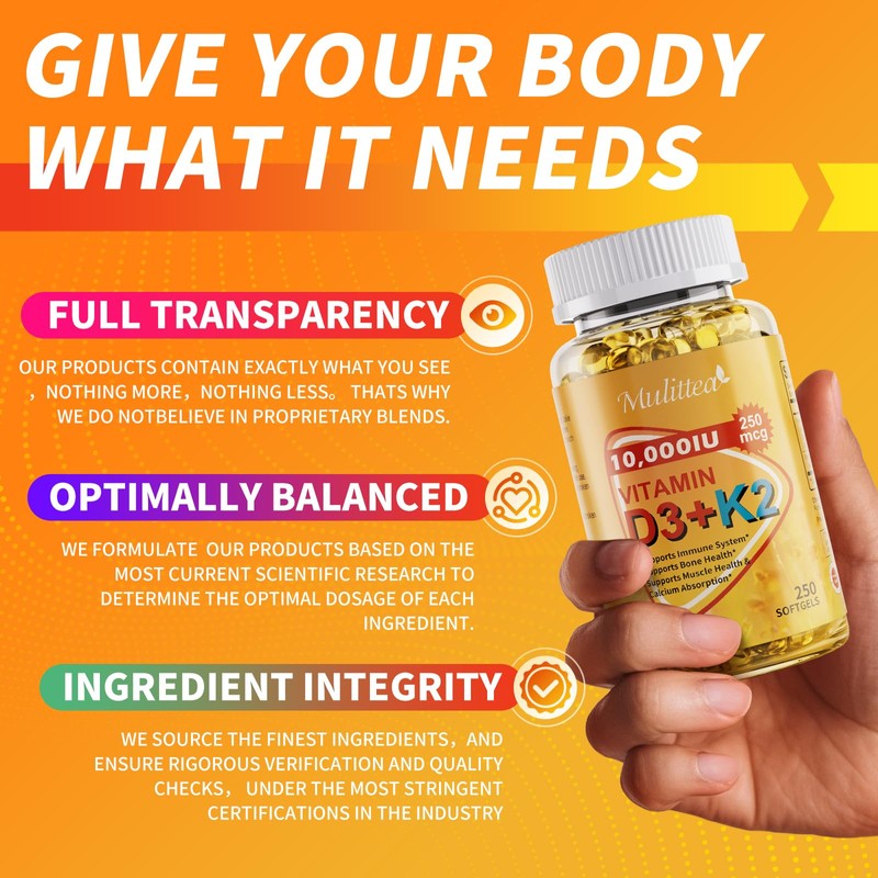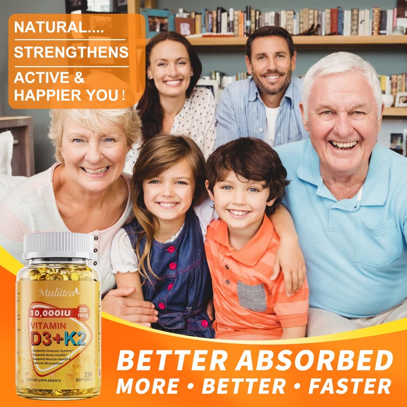 Mulittea Vitamin D3 K2, Bone and Heart Health Formula 10000 IU Vitamin D3 & 200 mcg Vitamin K2, Max Strength 2 in 1 Immune Support and Calcium Absorption, Gluten Free 250 Count