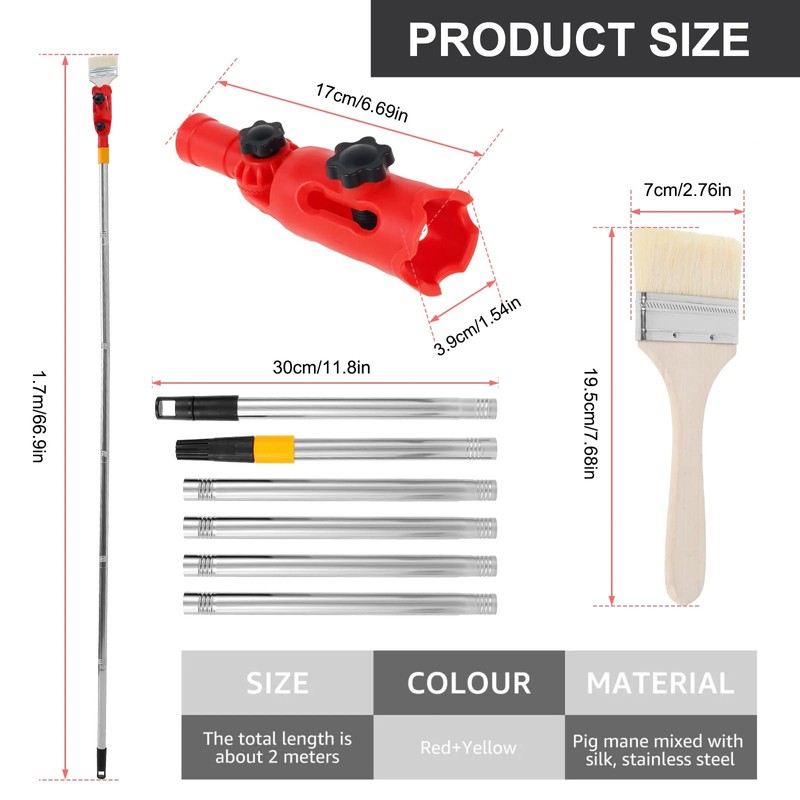 • Product includes: The extendable paint brush set includes a multi-angle paint brush extension pole, a 1.7 m long pole with a universal clamp (red clamp + 6-piece pole + 1 brush), ideal for various painting jobs and hard-to-reach areas. Perfect for precise painting without additional tools.