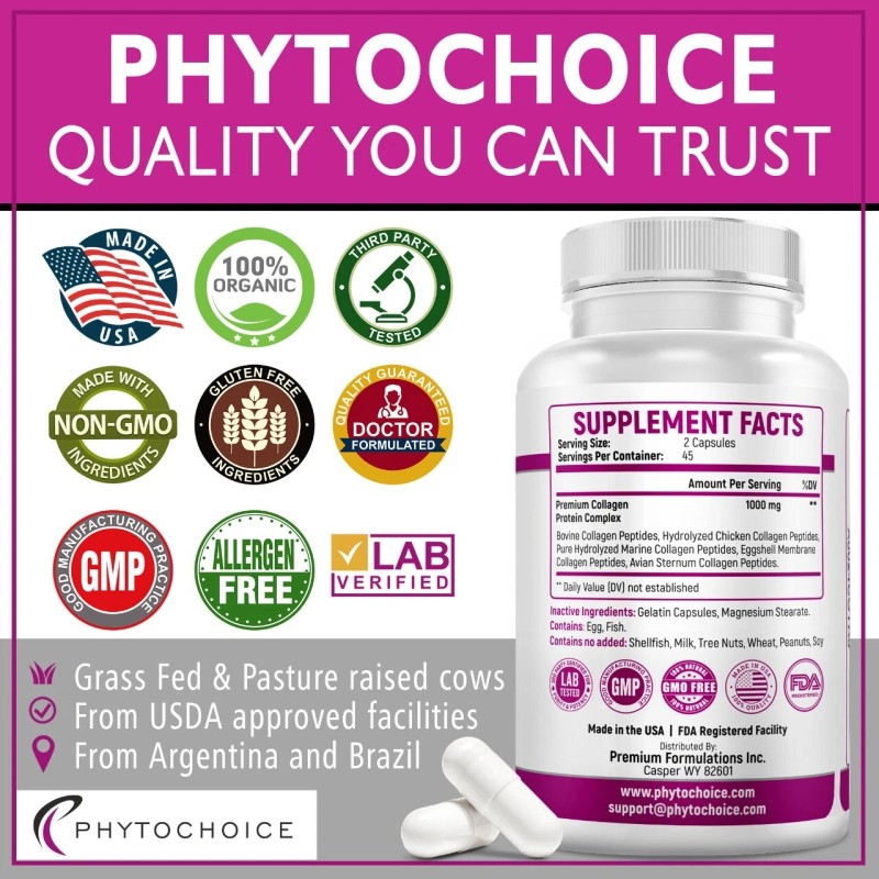 Multi Collagen Peptide Capsules (Type I,II,III,V,X) Anti-Aging Formula Hydrolyzed Collagen Supplement for Skin Hair Joints, Keto Friendly Super Collagen Hydrolysate Protein Peptide Pills for Women Men by PHYTOCHOICE