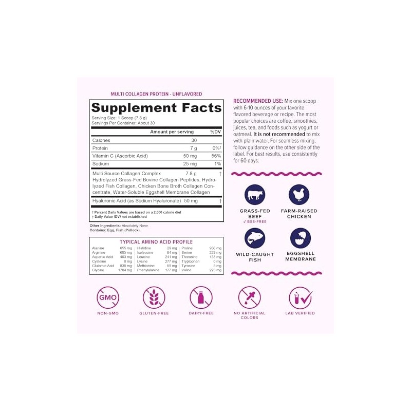 Multi Collagen Peptides Powder for Women and Men - Instant Dissolving Grass Fed Hydrolyzed Drink Mix for Beautiful Hair Skin and Nails with Hyaluronic Acid and Vitamin C | Unflavored 30 Servings