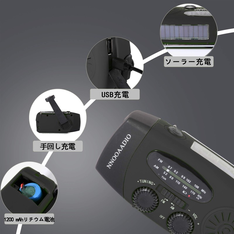 - (1,200 mAh High Capacity Battery) Built-in 1,200 mAh pure lithium battery, which is safer than the lithium manganese hybrid battery used in most radios, and has a longer battery life. This portable emergency radio has 3 charging methods. A Solar charging automatically charges the solar panel toward the sun. When not in use, it can be charged in sunlight. B. Hand crank charging, suitable for various environments. Rotate the handle for 1 minute (handle revolutions over 130) for 15-20 minutes of light use; 5-20 minutes of medium volume radio; 3-5 minutes of phone calls. C. USB charging, the fastest and most effective charging method Panel battery indicator will turn red when radio is charging