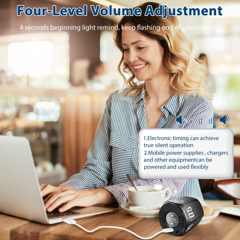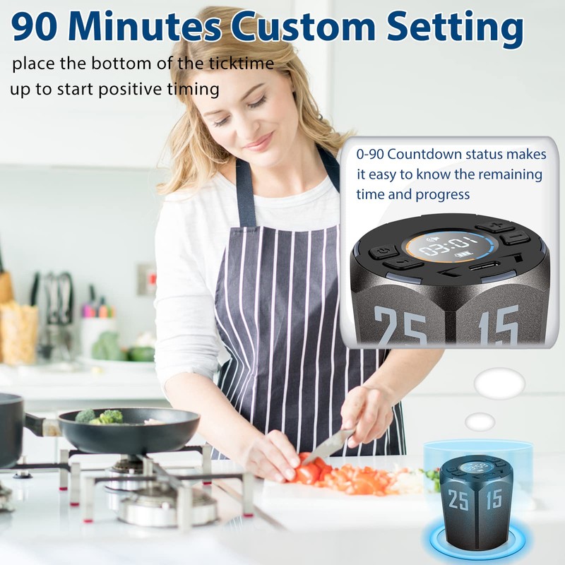 - 【Multiple scenes use】Digital timer Equipped with a precise gravity sensor system, no more struggling to set a timer with small buttons, just rotate to set time. The pomodoro timer has 5 preset timing modules to avoid having to reset it each time.(5/10/15/25/30 minutes.) Select the desired timing face up, When the blank side is facing up, the timing stops immediately.