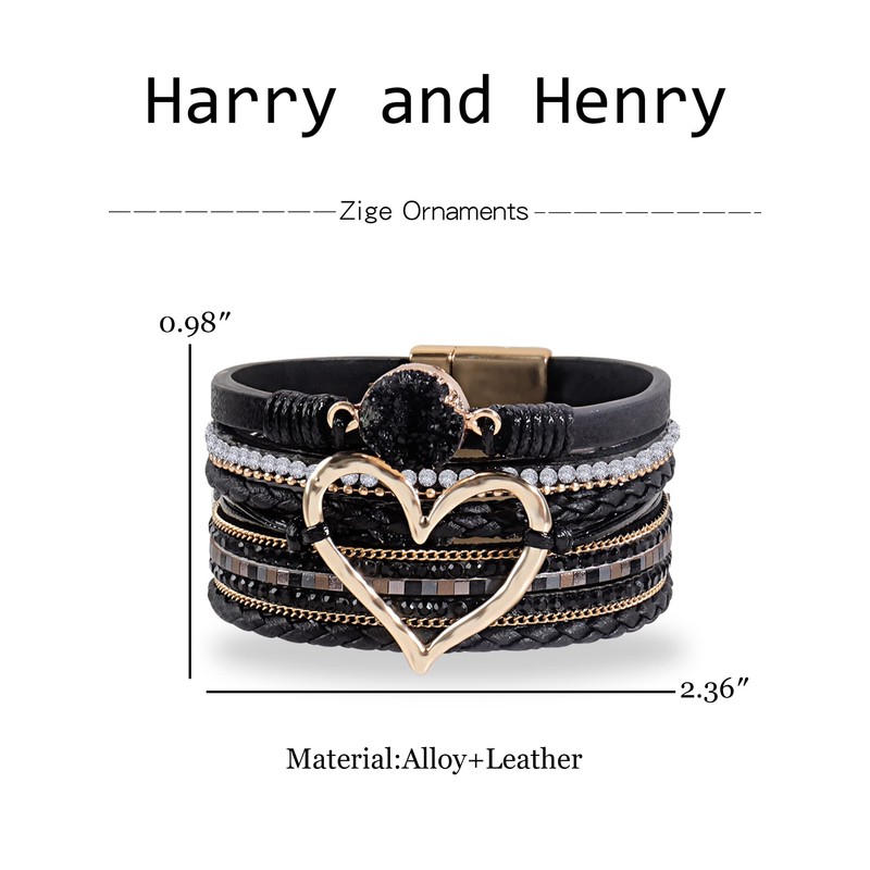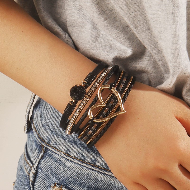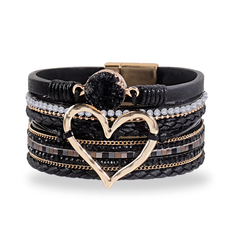 Multi-Layer Leather Bracelets for Women Heart Leather Cuff Bracelets Boho Wrap Stackable Bracelets Leather Wristband Cuff Bangle Bracelet with Magnetic Clasp (Black)