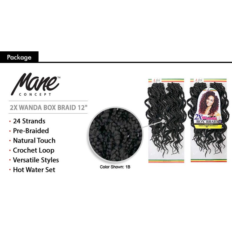 **Mane Concept Synthetic Hair Crochet Braids 2X Wanda Box Braid 12"** **\- 24 Strands/b > **Tousle Me Softly/b > Not all extensions can create a curly finish. Afri Naptural 2x Wanda Box Braid is here to fix that situation! No more grabbing the curling iron or hot water setting your box braids to achieve that curly look, this style is already curled for you. Using the finest premium quality of hair, this style is simple and easy for fast installation. Tousle Me Softly with 2x Wanda Box Braid. **Benefits/b >