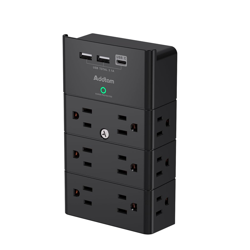 Multi Plug Outlet - Addtam Surge Protector Wall Mount with 12 Outlet Extender- 3 Sides and 3 USB Ports (1 USB-C), Outlet Splitter Power Strip for Home, Office, Hotel, Black