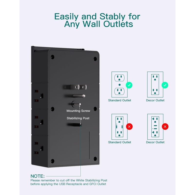 - 【Multiple Outlet Wall Plug】 12 AC outlets (125V, 15A,1875W) with surge protector wall mount, 3 USB ports, surge protection indicator light. With mounting screw and stabilizing rod, the outlet wall adapter can fit for the standard outlet, decorator outlet; For GFCL and USB Receptacle outlet, the stabilizing rod can be cut off