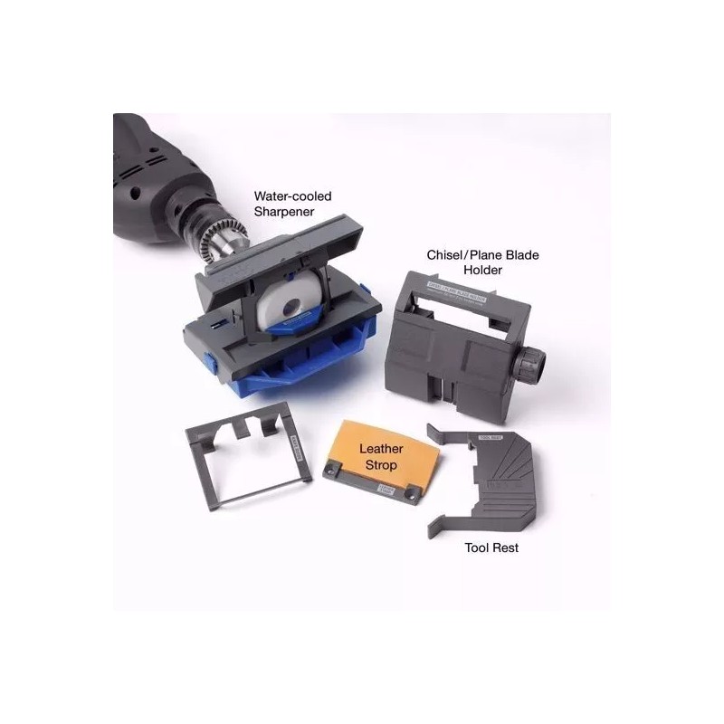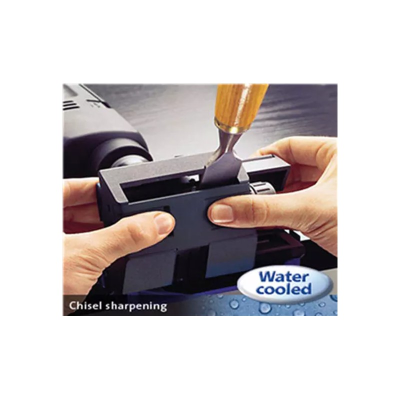 - WATER-COOLING is acknowledged by professionals to hone the finest edges. This compact system uses a controlled flow of water to eliminate the over-heating with a dry wheel and a chisel edge. Simply fill the built-in reservoir with water, turn on the power drill and a continuous film of water covers the face of the grinding wheel.
