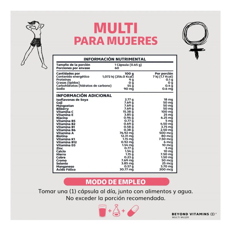 - +60 Cápsulas Multi Mujer Beyond Vitamins es un complejo de vitaminas que ofrece una combinación de ingredientes, incluyendo isoflavonas, mangostan, goji, bilberry y 20 vitaminas y minerales adicionales. Este producto no es un medicamento. El consumo de este producto es responsabilidad de quien lo recomienda y de quien lo usa. En caso de dudas, consulte a su médico. Características de Multi Mujer Beyond Vitamins: Libre de azúcares, lácteos y soya Libre de edulcorantes, colorantes, saborizantes, ingredientes artificiales ni conservantes No contiene hormonas No contiene antibióticos MODO DE EMPLEO: Tomar una (1) cápsula al día, preferiblemente junto con alimentos (idealmente con grasas saludables, tales como aguacate, nueces, semillas o aceites de oliva o vegetales) y agua. No exceder la porción recomendada. PRECAUCIONES: No se recomienda su uso en menores de 18 años, Manténgase fuera del alcance de los niños. Conservar en un lugar fresco y seco. No consumir si el sello ha sido violado. Consumir antes de la fecha de expiración. El consumo de este producto es responsabilidad de quién lo recomienda y de quién lo usa. RESTRICCIONES DE USO: No se recomienda el uso de este producto durante el embarazo y lactancia. Si se encuentra bajo tratamiento médico, presenta una condición médica o se encuentra próximo a un procedimiento quirúrgico, consultar un especialista antes de su consumo. En caso de generar alergia a algunos de sus componentes, suspenda su uso. Aviso legal