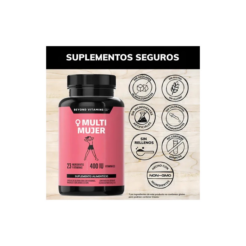 Multi Mujer Beyond Vitamins es un complejo de vitaminas que ofrece una combinación de ingredientes, incluyendo isoflavonas, mangostan, goji, bilberry y 20 vitaminas y minerales adicionales. Este producto no es un medicamento. El consumo de este producto es responsabilidad de quien lo recomienda y de quien lo usa. En caso de dudas, consulte a su médico.
