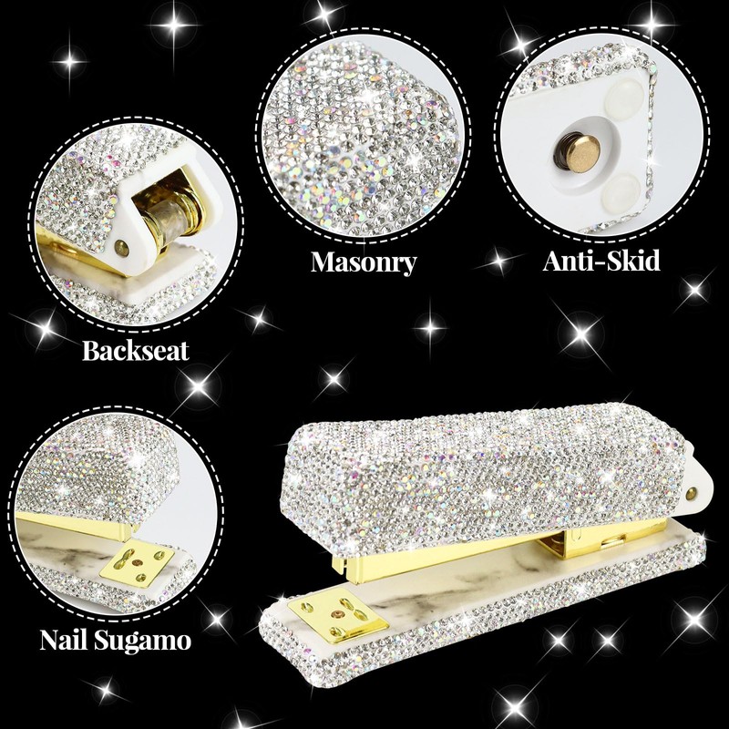 - 【Novelty Stapler & Tape Dispenser Set】These cute desk stapler and tape dispenser are made of premium acrylic, durable and sturdy; bling crystal combined with damond add a sleek and sophisticated touch to desk, cubicle, office and home