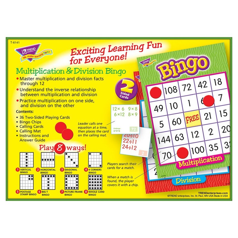 Master multiplication and division fact families through 12. Traditional 5 x 5 grid format can be played 8 ways to meet the needs of learners of all abilities. Fun for large or small group use. Set includes 36 different two- sided playing cards, 720 chips, caller's mat and cards, and a sturdy storage box. Ages 9 & up.
