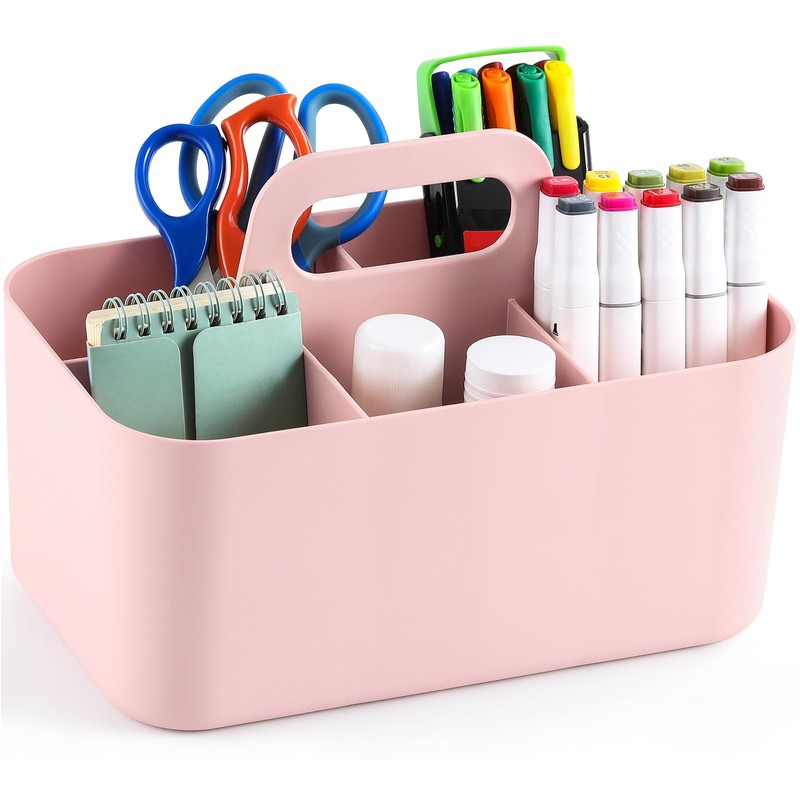 Multiuse Caddy Organizer with Handle - Stackable Plastic Tote Bin - Art Craft Supplies, Office, Desk, Stationery Pen Holder, Kitchen, Utensil, Makeup, Bathroom, Shower, Cleaning, Dorm Organizer - Pink
