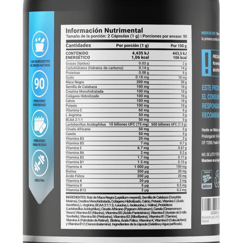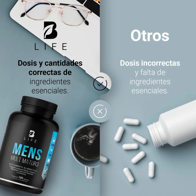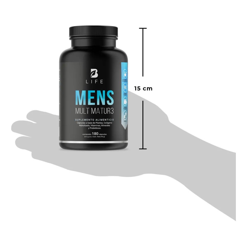¡Mens Mult Matur3 B Life, tu fuerza y vitalidad! Cada cápsula de 500 mg contiene nuestra fórmula excepcional que fusiona Maca negra, Semilla de Calabaza, Creatina Monohidratada, Colágeno Hidrolizado, Calcio, Potasio, y un completo espectro de vitaminas: C, B3, B5, B12, E, B6, B2, B1, A, K y D. Además, incorporamos ingredientes clave como L-Arginina, BCAA 2:1:1, Lactobacillus Acidophilus, Ciruelo Africano, Canela, Biotina y Ácido Fólico, a diferencia de otras presentaciones que carecen de esta valiosa sinergia de ingredientes valiosos para el hombre maduro. Contiene 180 cápsulas.